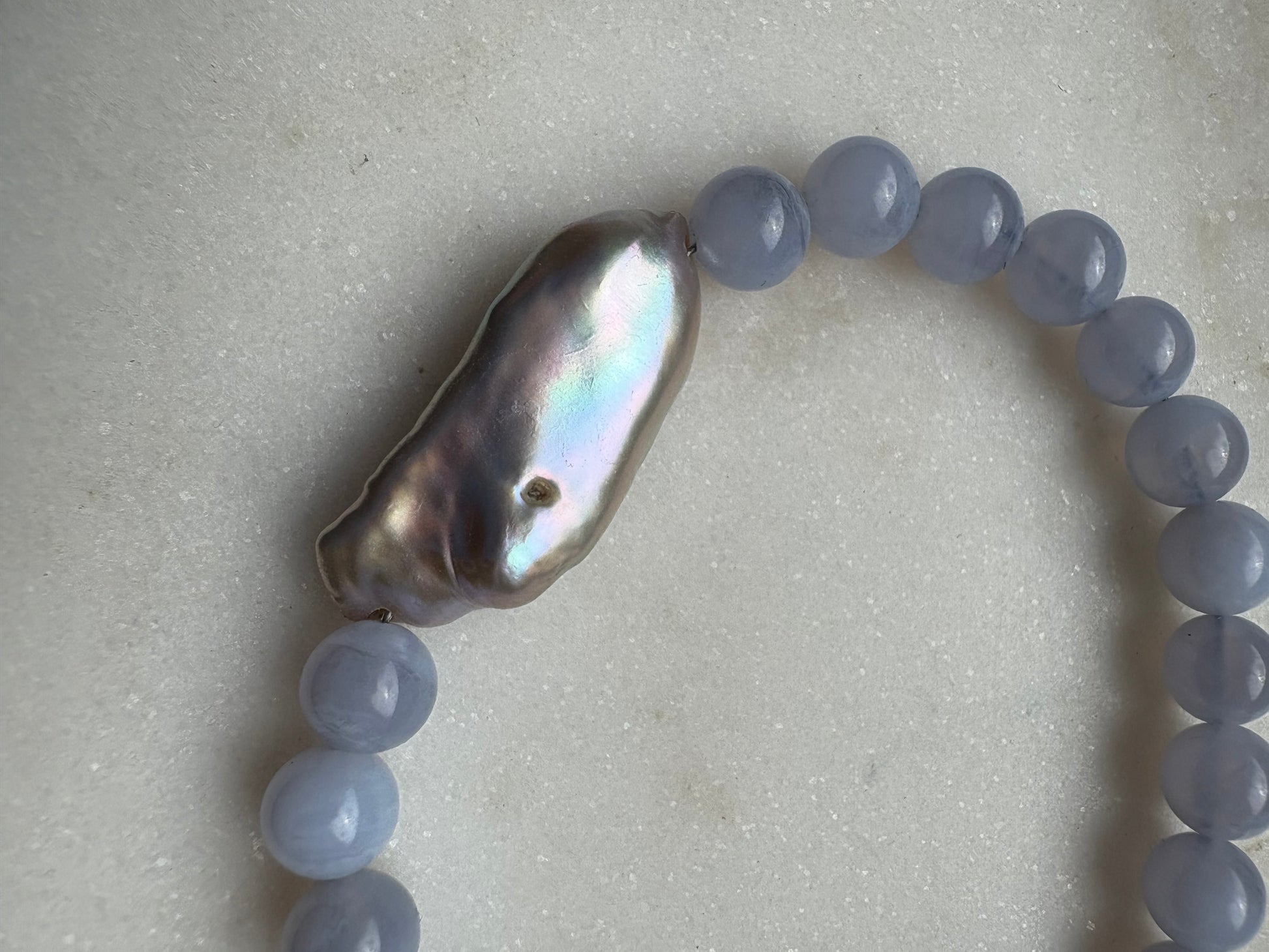 wunderschöne Halskette aus hellblauen kraftvollem Chalcedon; er beruhigt den Geist, stärkt die Stimme und öffnet das Herz für ehrliche Worte. Seine sanften Blautöne wirken beruhigend und schaffen eine Atmosphäre der Ruhe und Gelassenheit.🩵