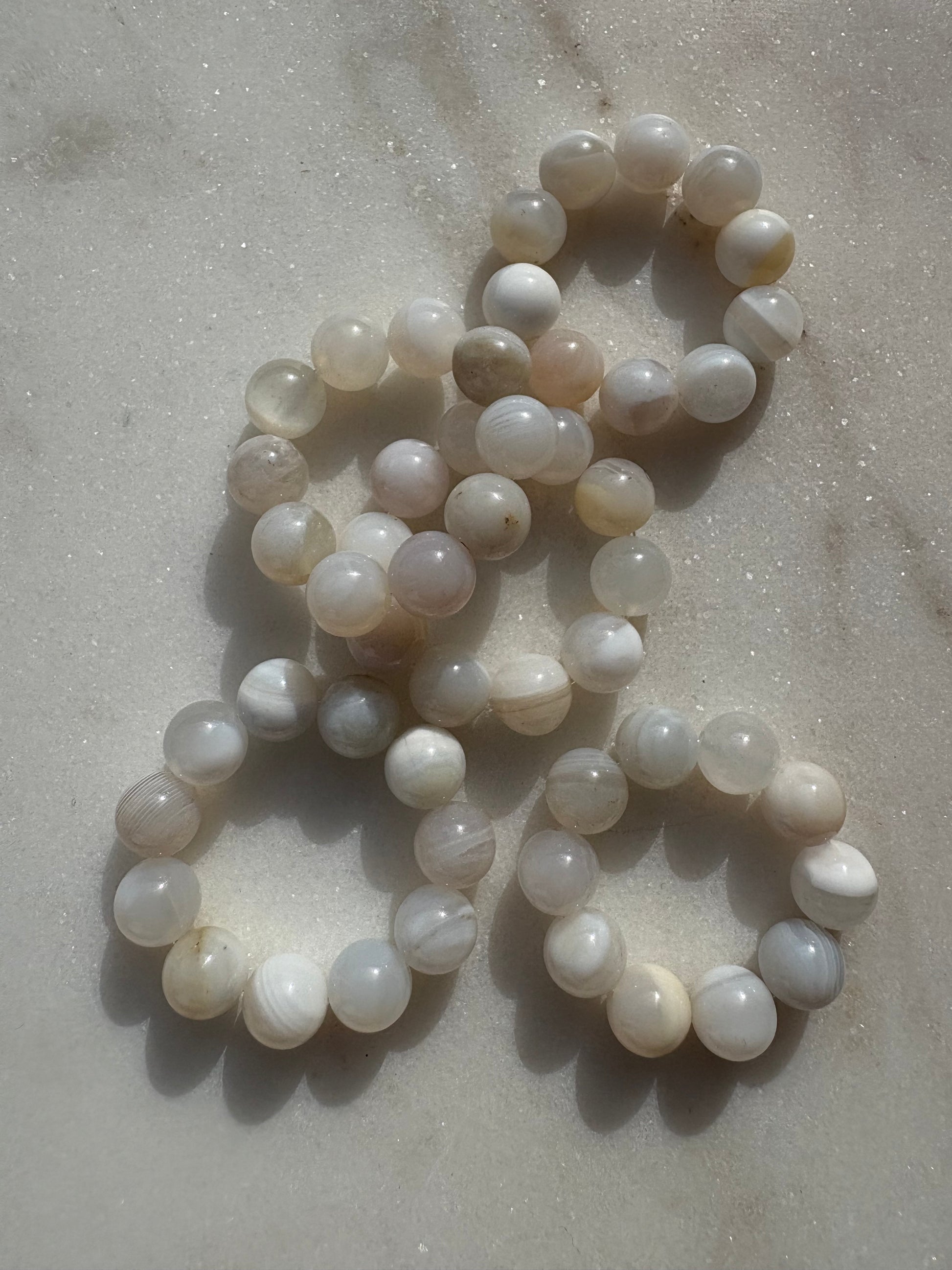 Wunderschöner 100 % echter, naturbelassener weißer, hellgrauer Achat – jede Perle einzigartig in Farbe und Struktur. Auf elastischem Band, angenehm zu tragen.